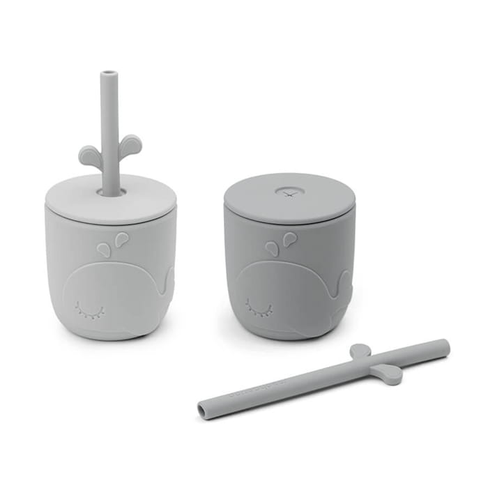 Kubki ze słomką są w dwóch odcieniach szarości. Pokrywki dołączone do zestawu pasują także do kubka z dzióbkiem z kolekcji Done by Deer Peekaboo.