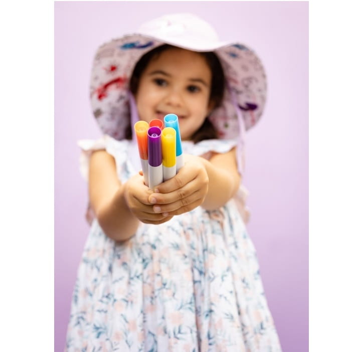 Zrób to sam! Dwustronny kapelusz do kolorowania Jednorożec jest podwójnie niesamowity! Po pierwsze, posiada dwa wzory do wyboru: jednorożca na fioletowym tle lub wzorzysty motyw z jednorożcami na białym tle. Twój maluch każdego dnia może wybrać inny! Po drugie, do kapelusza dołączone są specjalne zmywalne flamastry do malowania na tkaninach. Dzięki nim Ty lub Twój maluch możecie nadać kapeluszowi indywidualnego charakteru, kolorując wzorzysty motyw na białym tle na swój własny sposób. W dodatku, dzięki zmywalnym flamastrom możecie to robić każdego dnia od nowa - wystarczy, że wcześniej upierzecie kapelusz.