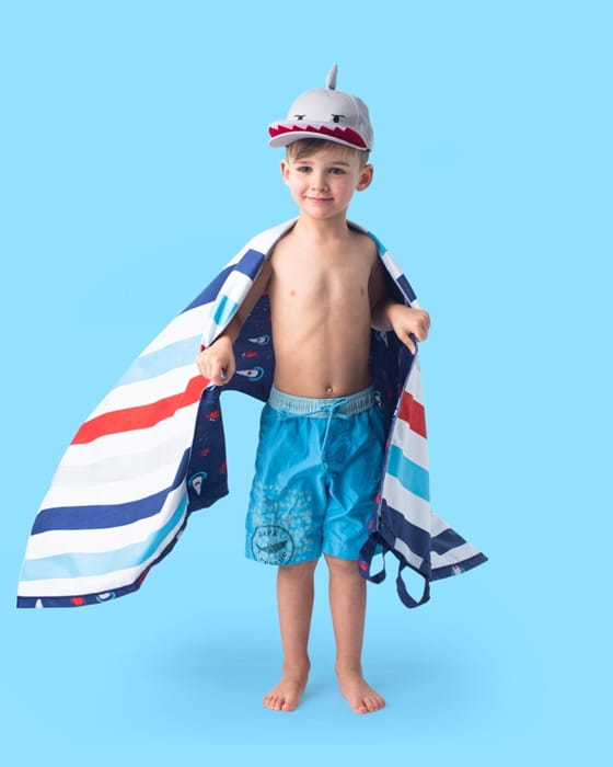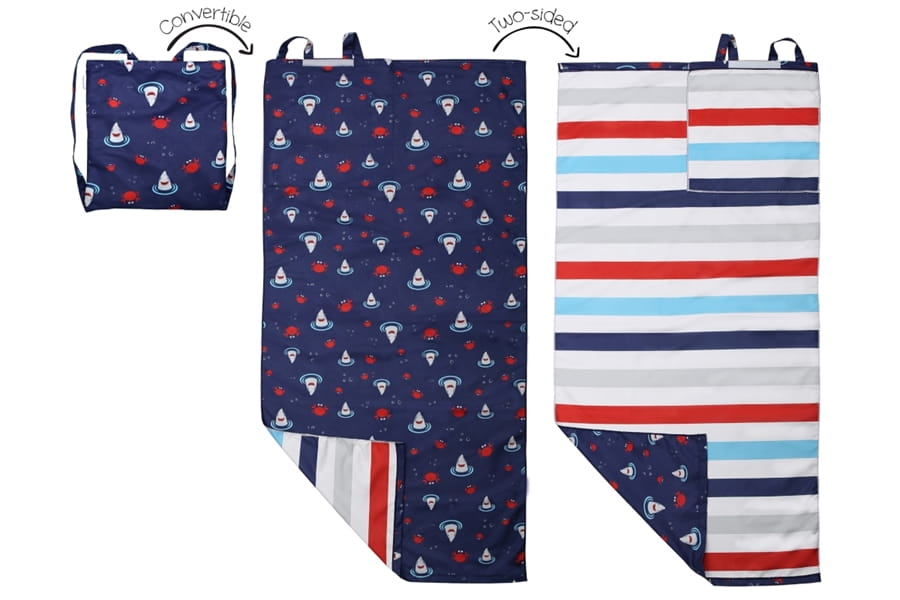 Dwustronny ręcznik plecak z łatwością przekształca się z plecaka w ręcznik lub plażową matę dla dzieci. Pokochasz go za uroczy wzór, ale także za jego praktyczność. Super miękki materiał jest chłonny, szybko schnie, a ziarenka piasku łatwo z niego strząsnąć. Zamieniony w plecak jest bardzo lekki nawet dla dziecka, a jednocześnie pojemny. Możesz włożyć do niego rzeczy osobiste – swoje lub dziecka. Ręcznik plecak FlapJack jest idealny na plażę, basen lub piknik.
