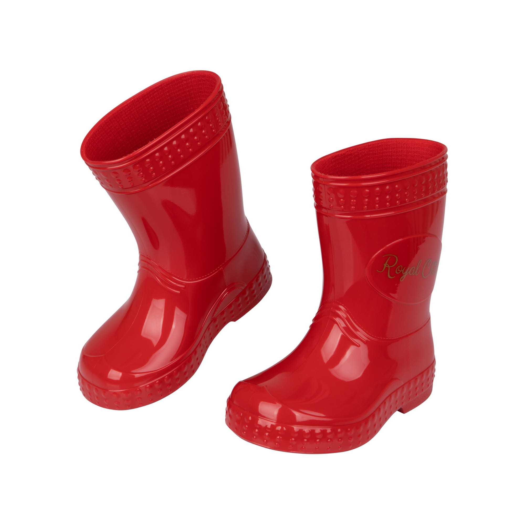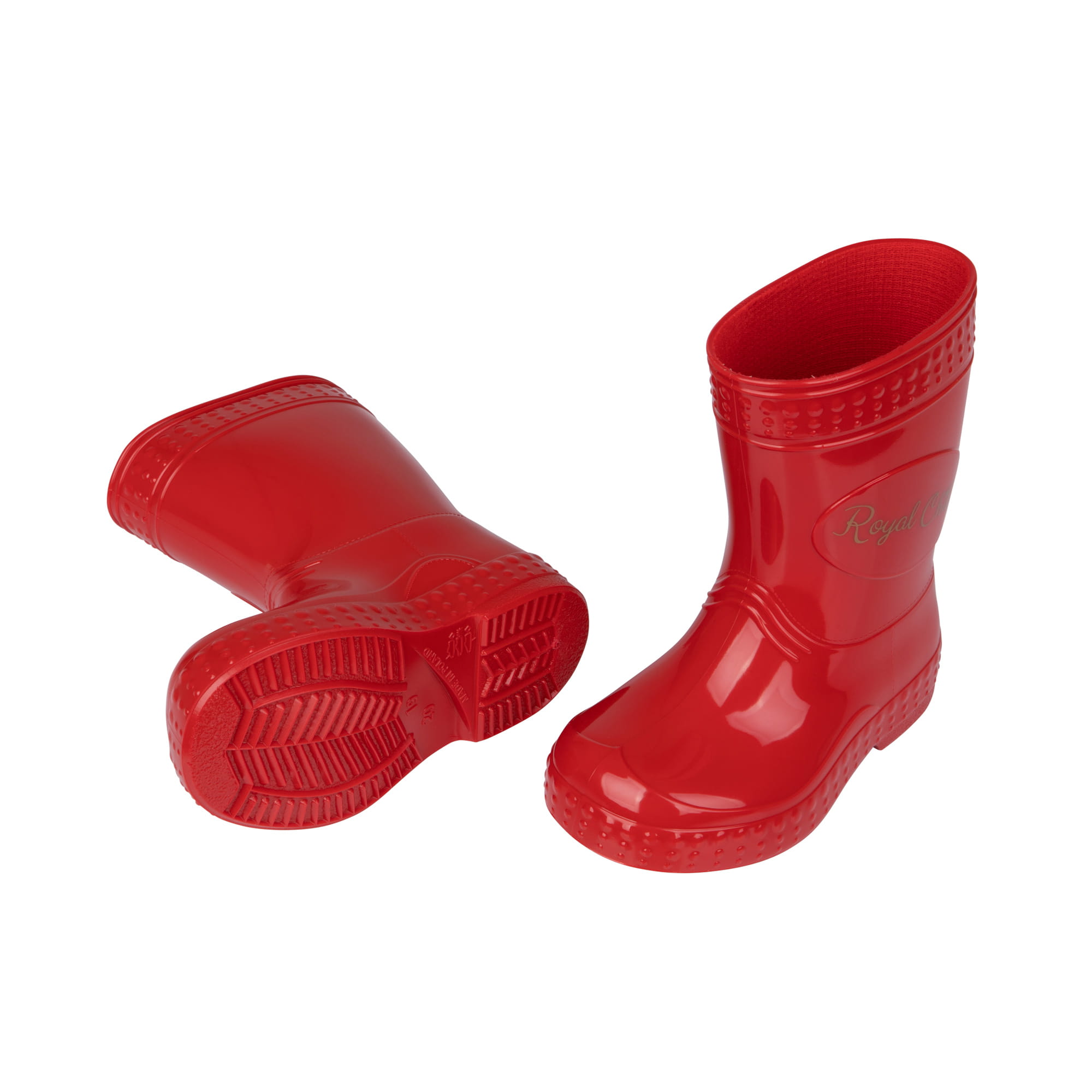 Wnętrze kaloszy jest wypełnione czerwoną skarpetką wewnętrzną, która jest zakładana już w procesie produkcyjnym. Składa się ona w 100% z bawełny. Na zewnątrz widzimy głęboki, czerwony kolor wraz ze stylowymi naklejkami – na jednym bucie z motywem złotej korony, a na drugim z napisem „Royal Child”. Naklejki te są dokładnie zgrzewane w procesie produkcyjnym, dzięki czemu cechują się one odpornością na zniszczenia.