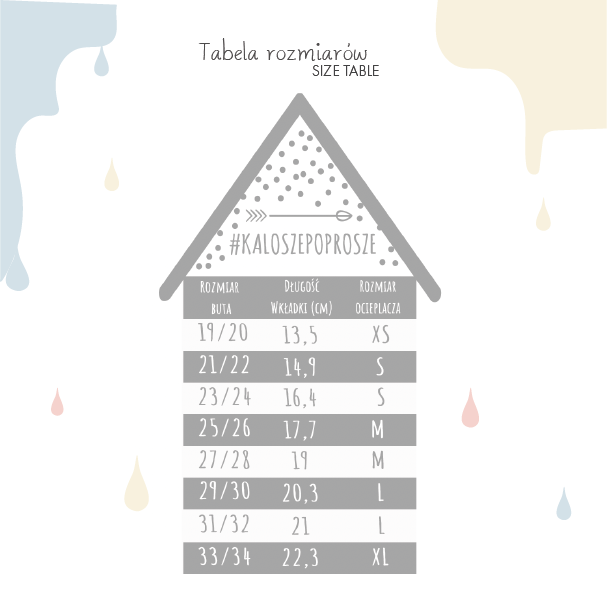 Dla przykładu, jeśli Twoje dziecko nosi buty innych marek w rozmiarze 21/22, to prawdopodobnie idealne dla niego będą kalosze o rozmiar mniejsze, czyli 19/20.