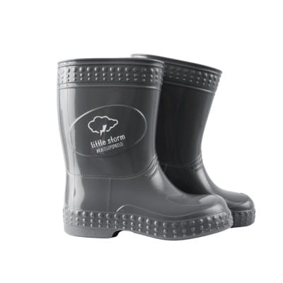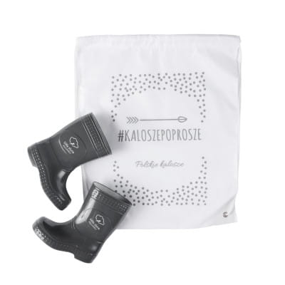 Wnętrze kaloszy jest wypełnione białą skarpetką wewnętrzną która jest zakładana już w procesie produkcyjnym – 100% bawełniana. Na zewnątrz – grafitowy kolor! Oraz na zewnątrz widoczna naklejka z napisem little storm – jest to naklejka która również w procesie produkcyjnym jest zgrzewana dzięki czemu jest absolutnie niezniszczalna.