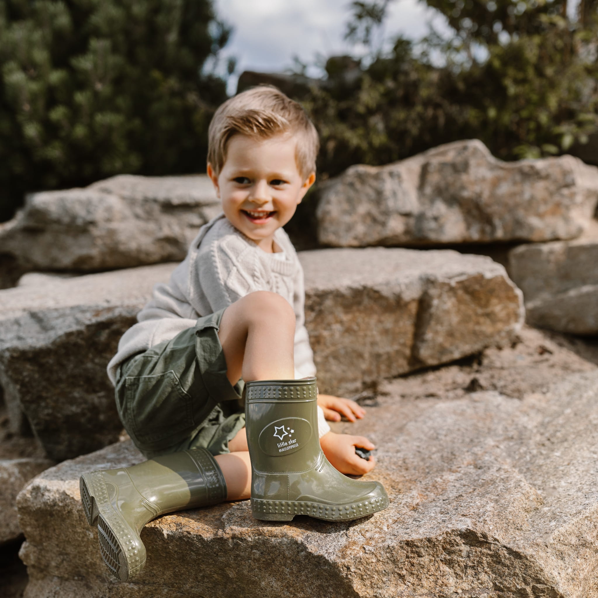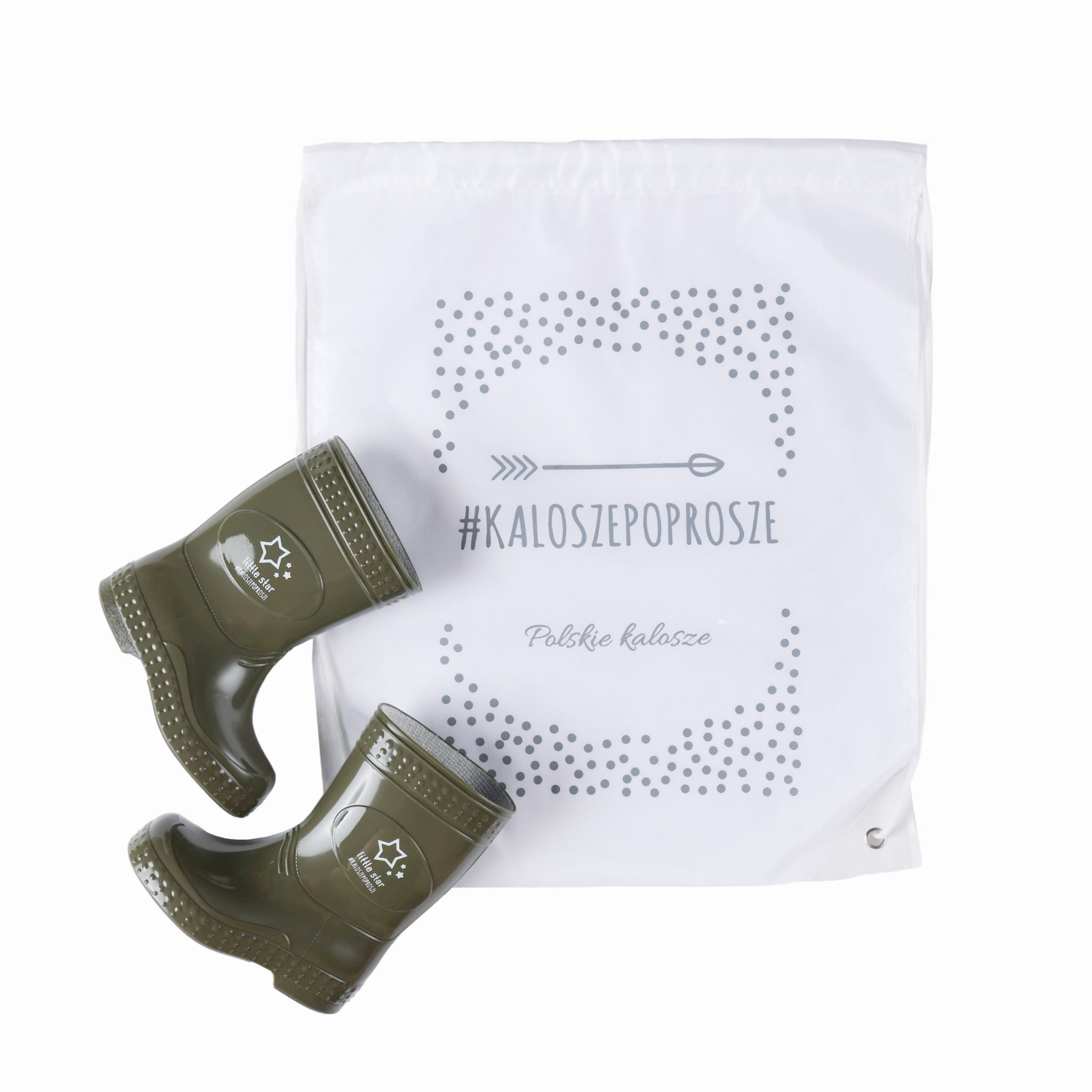 Wnętrze kaloszy jest wypełnione białą skarpetką wewnętrzną która jest zakładana już w procesie produkcyjnym – 100% bawełniana. Na zewnątrz – khaki kolor! Oraz na zewnątrz widoczna naklejka z napisem little star – jest to naklejka która również w procesie produkcyjnym jest zgrzewana dzięki czemu jest absolutnie niezniszczalna.