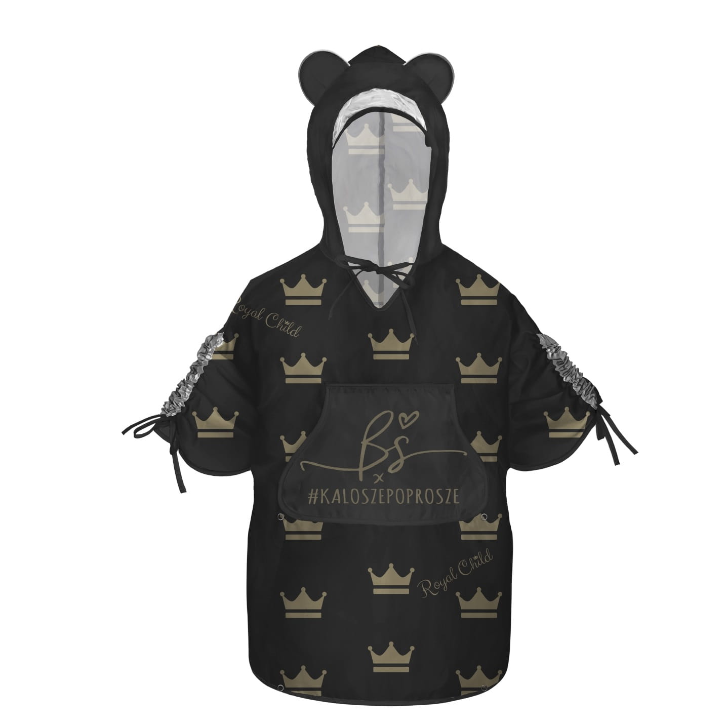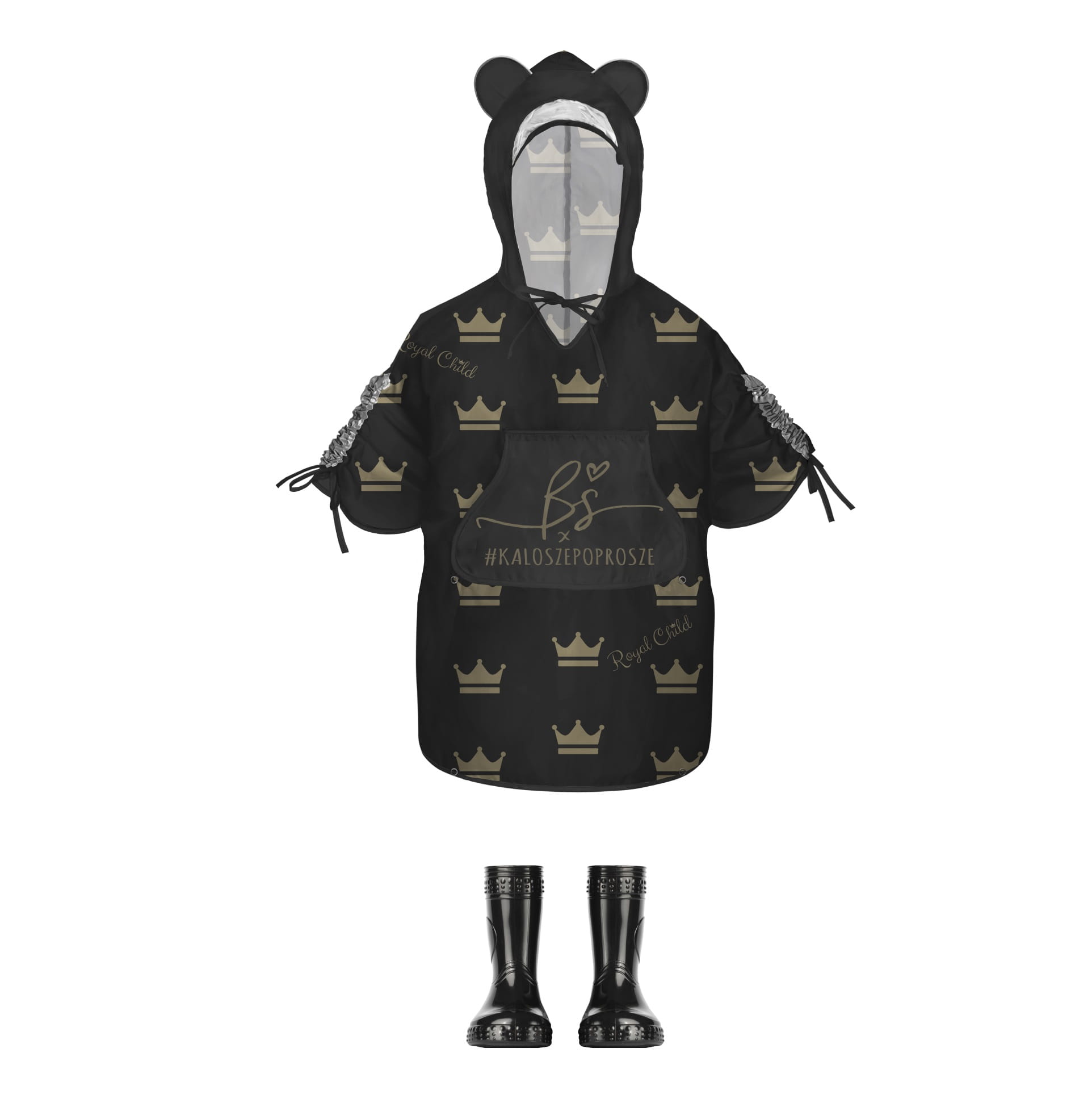 Ponczo w kolorze czarnym dobranego specjalnie na nasze zamówienie pod kolor kaloszy z kolekcji Royal Child - Czarny - Korona . I właśnie na płaszczyku znajdują się identyczne korony jak na kaloszach. W zestawie wyglądają wspaniale - ale będzie równie pięknie komponował się z innymi kolorami z naszych kolekcji.