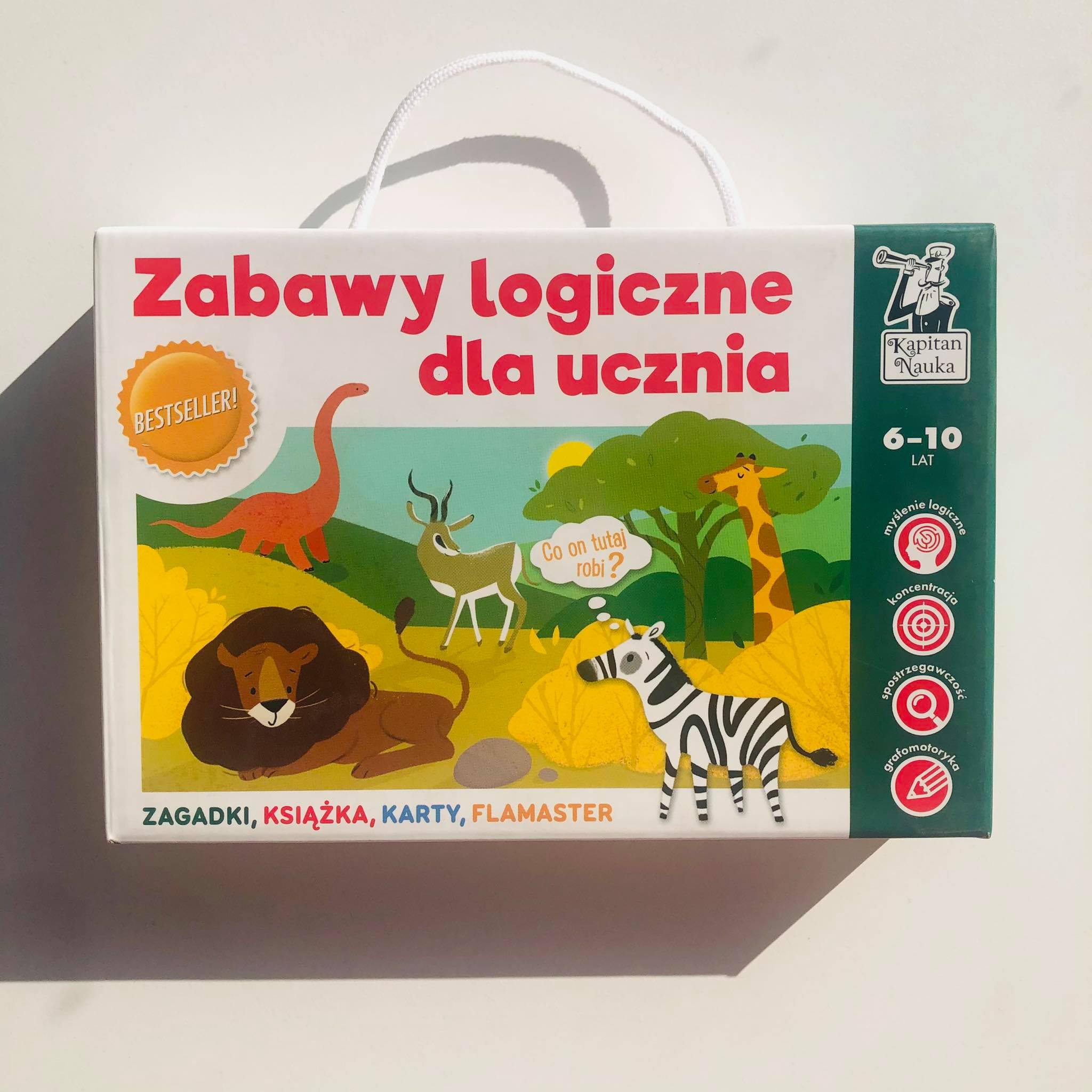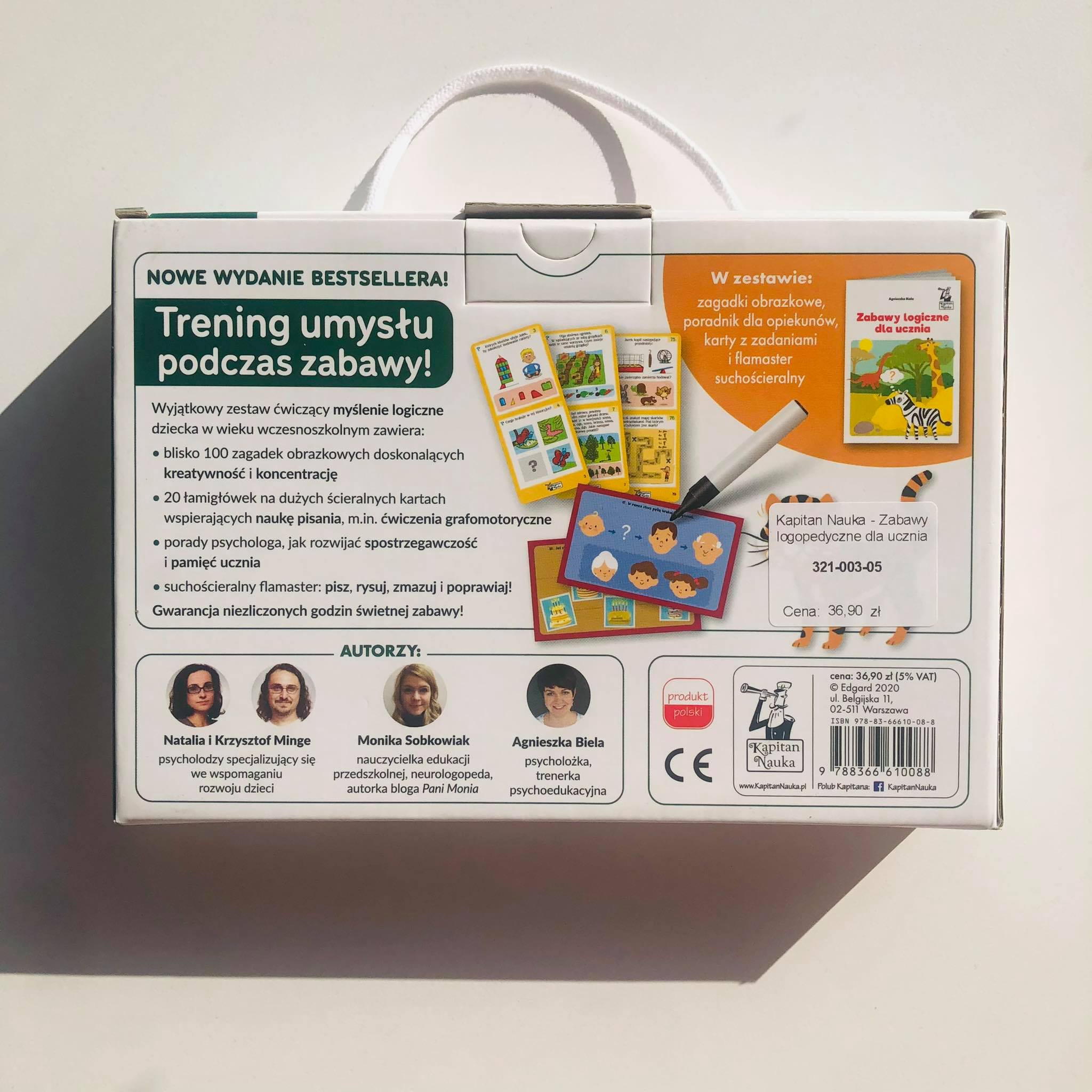 Zabawy logiczne dla ucznia (6–10 lat) to zestaw edukacyjny rozwijający efektywne myślenie, zdolności językowe i matematyczne. Zadania o różnym stopniu trudności przygotowują do nauki czytania, pisania i wykonywania działań matematycznych wymaganych na etapie edukacji wczesnoszkolnej. Dzięki atrakcyjnej formie łamigłówek i zagadek uczniowie rozwijają koncentrację uwagi oraz umiejętność poszukiwania niestandardowych rozwiązań. Poradnik dla opiekunów zawiera wskazówki psychologa, jak kształtować pamięć i spostrzegawczość, by służyły efektywnej nauce i szybkiemu przyswajaniu nowych umiejętności. Trening intelektu, czyli gimnastyka dla mózgu! Zestaw zabaw logicznych został opracowany przez psychologów i nauczycieli pracujących na co dzień z dziećmi. Ich celem jest wspieranie efektywnego myślenia, umiejętności analizowania informacji i łączenia faktów, a także rozumienia związków przyczynowo-skutkowych. Pakiet zawiera blisko 100 zagadek obrazkowych rozszerzających wiedzę o świecie oraz doskonalących kreatywność. Łamigłówkom towarzyszą przyjazne ilustracje Filipa Depy. Na dużych ścieralnych kartach ilustrowane przez Sarę Olszewską znajdują się zadania przygotowujące do nauki pisania, m.in. ćwiczenia grafomotoryczne i trenujące koordynację oko-ręka. Flamaster suchościeralny pozwala na wielokrotne rozwiązywanie zadań. Do zestawu dołączono również poradnik dla opiekunów opracowany przez psycholożkę Agnieszkę Bielę z poradami, jak rozwijać spostrzegawczość i pamięć ucznia. Jest to nowe wydanie bestsellera Zabawy logiczne dla ucznia (6–9 lat). Rozwój myślenie logiczne, koncentracja, spostrzegawczość, grafomotoryka Autorzy Agnieszka Biela – psycholożka i trenerka psychoedukacyjna. Natalia i Krzysztof Minge – psycholodzy specjalizujący się we wspomaganiu rozwoju dzieci. Monika Sobkowiak – nauczycielka edukacji przedszkolnej, neurologopeda. Autorka bloga Pani Monia, który jest kopalnią inspiracji dla twórczych nauczycieli. Filip Depa – leworęczny ilustrator, grafik, fan pixarowych produkcji, produktów Wacoma oraz wszelakich artykułów papierniczo-plastycznych. Mieszka i tworzy w Krakowie. Sara Olszewska – ilustratorka i graficzka, absolwentka Instytutu Wzornictwa Politechniki Koszalińskiej, wyróżniona „Dyplomem FNC 2018”. Projektuje z myślą o dzieciach. Prowadzi autorskie warsztaty plastyczne.
