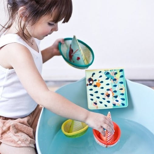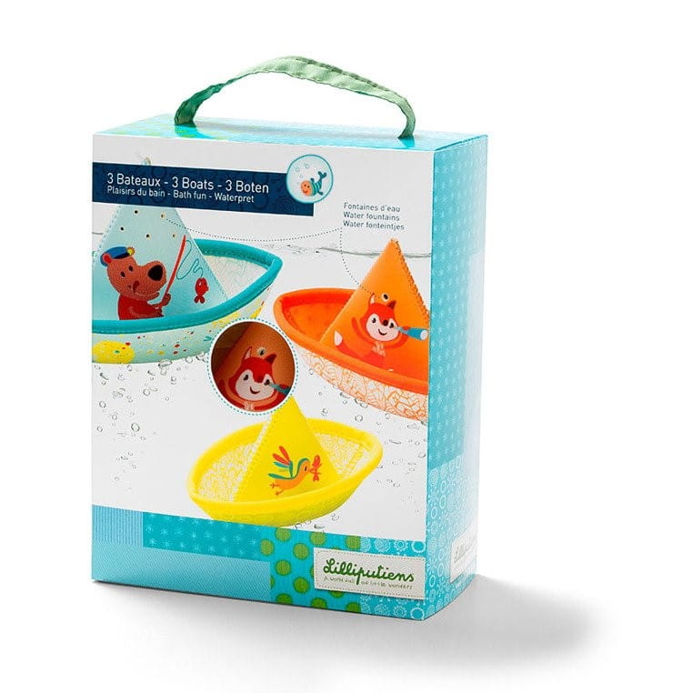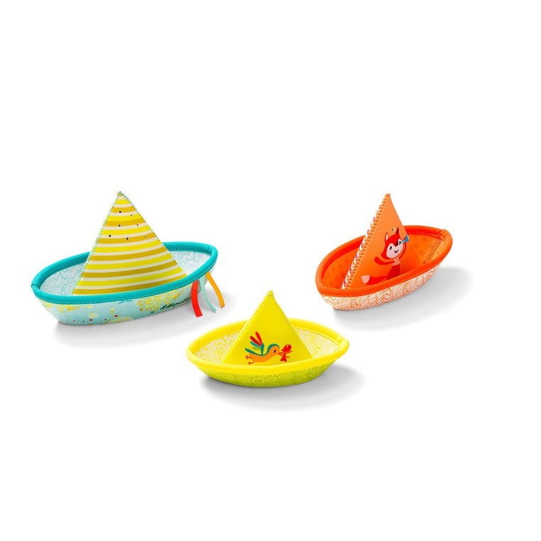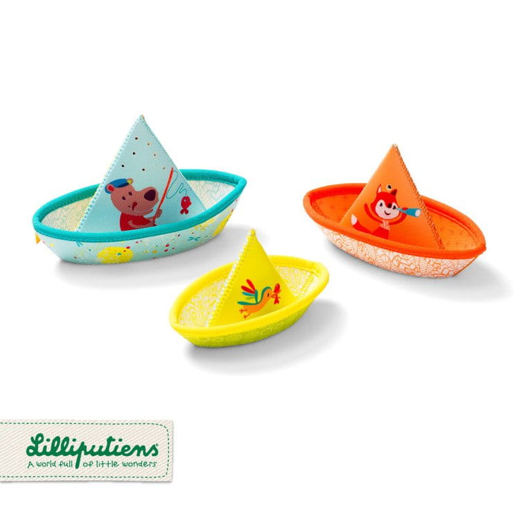 Zestaw 3 łódeczek do kąpieli belgijskiej marki Lilliputiens, wykonanych z miękkiego, łatwego do czyszczenia i szybkoschnącego neoprenu. Łódeczki zdobią z jednej strony postacie charakterystycznych dla marki zwierzątek – Niedźwiadka Cesara i Lisiczki Alice oraz barwnego ptaszka, z drugiej – kolorowe paski. Mają klasyczny kształt „łódki z papieru”, są lekkie, miękkie i unoszą się na wodzie. Każda z nich ma otwór bądź otwory na czubku „żagla”, dzięki czemu po rozłożeniu, obróceniu do góry dnem i napełnieniu wodą, tryska jak fontanna. Zabawka jest perfekcyjnie wykończona, z dbałością o każdy szczegół i w pełni bezpieczna dla dziecka. Rozwija sprawność motoryczną i koordynację ręka-oko.