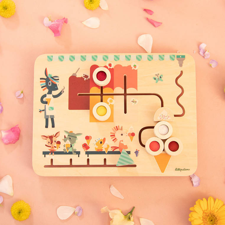Tablica manipulacyjna – gra kompozycjna Lodziarnia belgijskiej marki Lilliputiens to niebanalne wielofunkcyjne źródło rozrywki i nauki dla ciekawskich maluszków. Na drewnianej planszy namalowane jest wnętrze lodziarni – miejsce nakładania lodów oraz ławeczki, na których siedzią goście ze swoimi przysmakami. Dwa tory z klockami do przesuwania pozwalają na kreatywną zabawę i grę tablicą. Na jednym torze należy ustawić trójkątny wskaźnik przy wybranej postaci, potem zaś na drugim torze odtworzyć jej deser, przesuwając odpowiednie smaki lodowych kulek do rożka w dolnym rogu planszy i ewentualnie ozdabiając je posypką. Klocki-kulki lodów mają nie tylko różne kolory, ale i faktury, co dodatkowo stymuluje sensorycznie maluszka. Zabawkę zdobią charakterystyczne postacie marki: lodziarzem jest Osiołek Ignace, a gośćmi Sarenka Stella, Smok Joe, mały czerwony ptaszek, Kaczorek Gaspard i Jednorożec Louise. Gra jest solidnie wykonana i w pełni bezpieczna. Pomalowana jest bezpiecznymi farbami na bazie wody. Zaskakuje i pobudza dziecięcą wyobraźnię. Rozwija koordynację ręka-oko, małą motorykę (chwytanie, przesuwanie), uczy rozróżniania kolorów, sortowania i odtwarzania sekwencji.