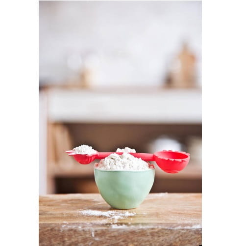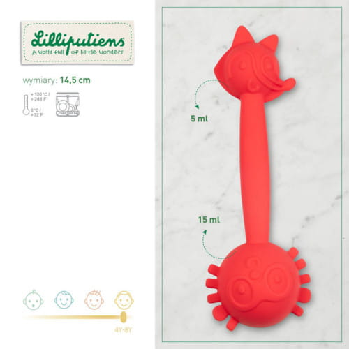 Łyżeczka z miarką 2w1 z kolekcji Lemur George belgijskiej marki Lilliputiens to idealne pierwsze narzędzie kuchenne małego miłośnika gotowania. Łyżeczka ma kolor czerwony, a jej miseczki po zewnętrznej stronie mają kształt zwierzęcych pyszczków – większa o pojemności 15 ml to Lemur Geogre, mniejsza o pojemności 5 ml to Lisiczka Alice. Miarka została wykonana z trwałego, bezpiecznego i higienicznego silikonu spożywczego, można ją myć w zmywarce i jest odporna na temperatury w przedziale od 0 do 120°C. Ładna, poręczna i funkcjonalna – zachęca dziecko do zabawy w naśladowanie dorosłych i podejmowanie kulinarnych wyzwań, dzięki czemu uczy się samodzielności.