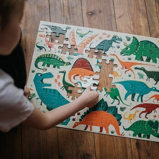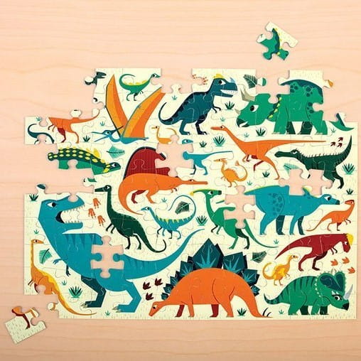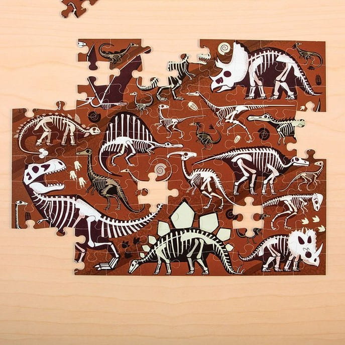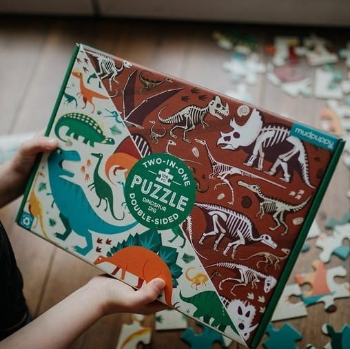 Puzzle dwustronne Dinozaury amerykańskiej marki MUDPUPPY nadają układaniu puzzli nowy wymiar – na samym złożeniu sporego obrazka (o wymiarach 55 x 42 cm) zabawa się bowiem nie kończy. Po obróceniu go okazuje się bowiem, że na drugiej stronie powstała kolejna, zupełnie nowa ilustracja! Następnym razem dziecko może zacząć układanie właśnie od niej. Jedna strona puzzli przedstawia wiele gatunków dinozaurów na jasnym tle, druga – ich niezwykłe szkielety na tle brązowym. Niebanalny design i piękne kolory dodatkowo zachęcają do zabawy. Taka układanka to również świetny sposób na pierwsze lekcje botaniki i poznanie ciekawych gatunków stworzeń.