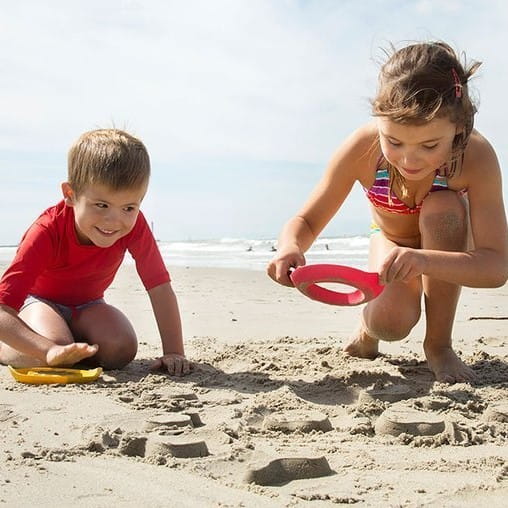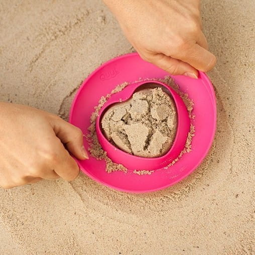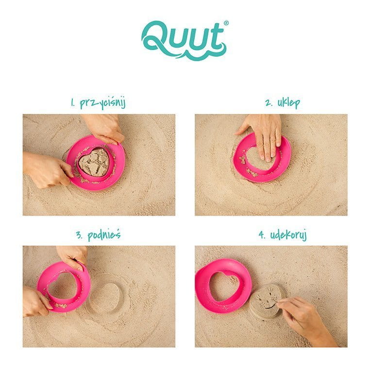 Zestaw dwóch foremek wielofunkcyjnych SunnyLove belgijskiej marki Quut przyciąga wzrok niebanalnym designem i oryginalną kolorystyką. Lekkie, wygodne do trzymania przez dziecko, w formie płaskich okrągłych dysków z otworami w kształcie serduszka i słoneczka. Foremki służą do odciskania kształtów, np. w piasku, śniegu, czy w piasku kinetycznym w domu. Po przyciśnięciu foremki np. do powierzchni piasku, wypełnia się nim ona, dzięki czemu można „wycisnąć” dany kształt, który następnie dziecko może dodatkowo jeszcze ozdobić. Tego typu sposób znacznie ułatwia dziecku „lepienie babek”. Foremki unoszą się na wodzie, a ich szerokie dna sprawiają, że są stabilne. Dwie foremki można połączyć ze sobą (za pomocą systemu click-and-store) dla wygodniejszego przenoszenia lub przechowywania. Gwarantują inteligentną aktywność w domu i na świeżym powietrzu, i to przez cały rok. Sprawdzą się bowiem nie tylko do zabaw w piasku (w tym w piaskownicy), ale także w wodzie (w tym w wannie), śniegu, ogrodzie czy domu.