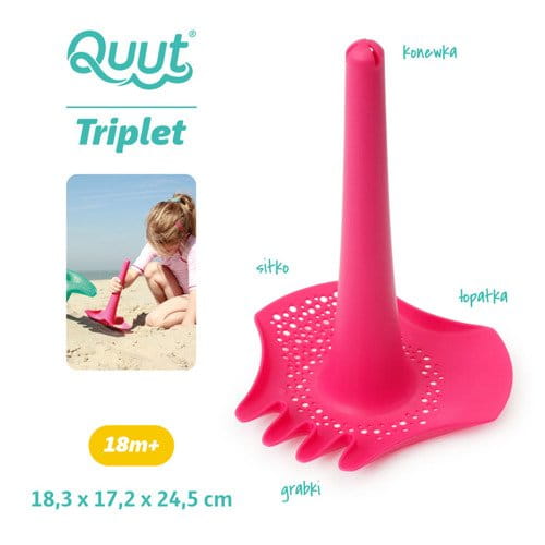 Łopatka wielofunkcyjna Triplet belgijskiej marki Quut przyciąga wzrok niebanalnym designem i oryginalną kolorystyką. Jest poręczna, lekka i łatwa do utrzymania przez dziecko. To prawdziwie wszechstronne narzędzie 4 w 1: może być łopatką, grabkami, sitkiem i lejkiem do wody. Można także przenosić na niej np. muszelki lub wykorzystywać w każdy, dowolny sposób, jaki podpowie dziecku wyobraźnia. Gwarantuje inteligentną aktywność na świeżym powietrzu, i to przez cały rok. Sprawdza się bowiem nie tylko do zabaw w piasku, ale także w wodzie (nawet w wannie), śniegu czy ogrodzie.